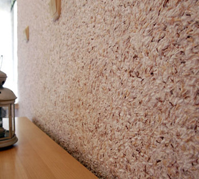 Полученный состав наносится на стену с помощью шпателя, а затем, слой разравнивается валиком.