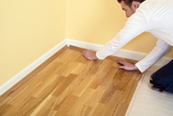 Трещины можно заделать верёвками, пропитанными в олифе или оксолью. Перед самой укладкой ламината требуется постелить подложку из линолеума, дернита, вспененного полеэтилена, или пробкового полотна, что обеспечит эффект “пружины” ламината при нагрузке, тепло и звукоизоляцию. Швы при укладке будут менее заметны, если улаживать ламинат таким образом, чтоб они располагались параллельно световому потоку из окна. Первый слой ламината укладывается, соблюдая зазор между доской и стенами около 10 -15 мм, в которые забиваются клинья, для того, чтоб доска не смещалась при укладке. Финальной стадией в укладке считается наложение плинтусов, которые должны не прижимать доску ламината, а нависать над ней.